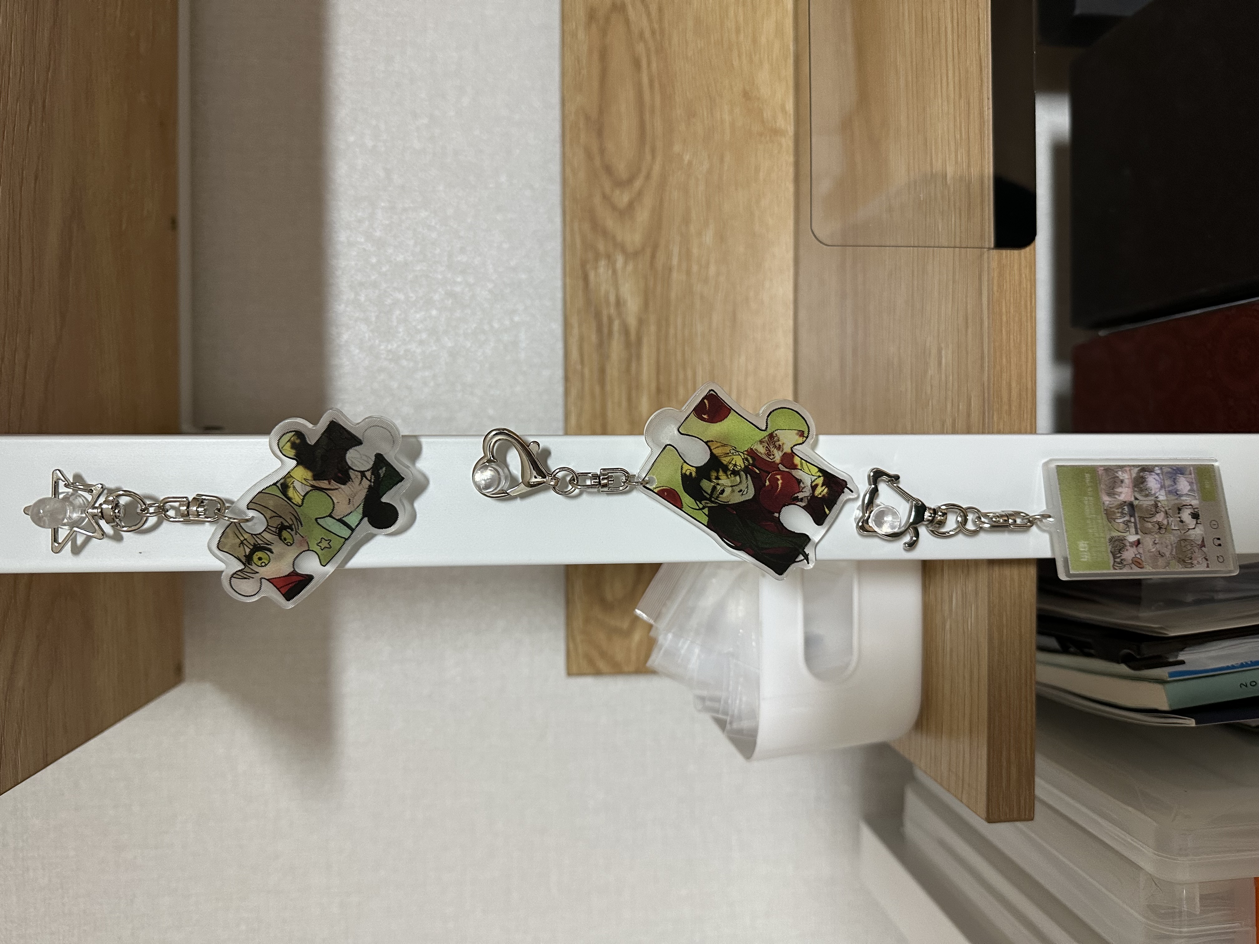아크릴 중복되는 건 비닐 뜯어서 걸어놨고, 아닌 것들은 안에 소중하게 모셔두었어요 ^///^